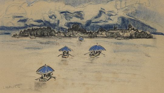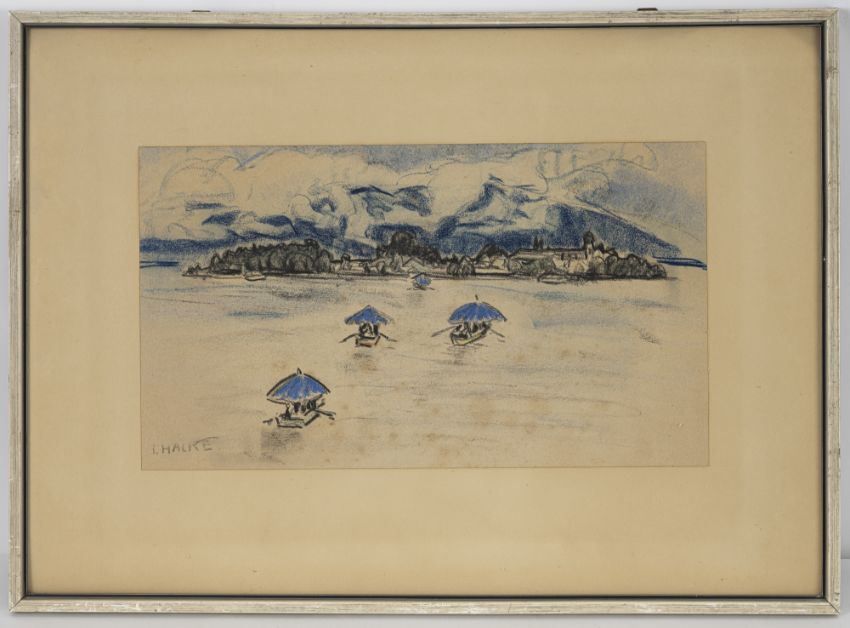 Prozession auf dem Chiemsee. Pastell auf Papier. In Pastell unten links signiert.