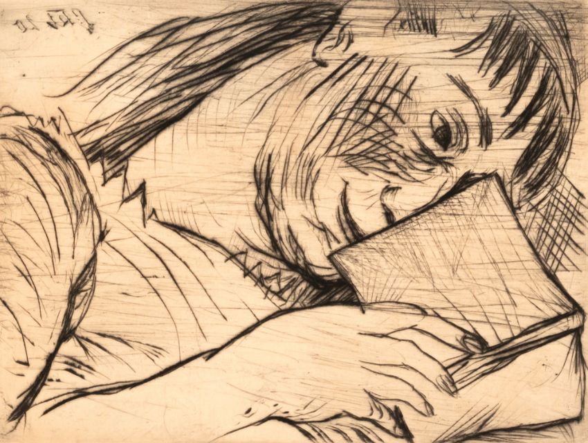 Kleinschmidt, PaulBublitz, 1883 - Bensheim/Bergstrasse, 194914,8 x 19,5 cm, o. R."Lesende", 1920. Radierung auf Bütten. In Bleistift unten links signiert, datiert und betitelt sowie unten rechts bezeichnet "Probe".Sammlung Barbara Lipps-Kant, Tübingen.