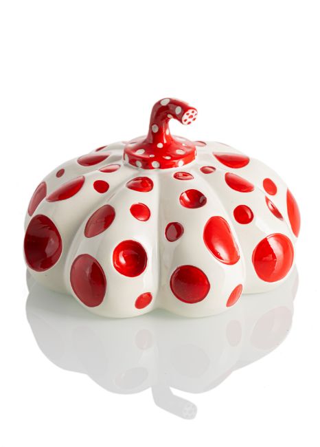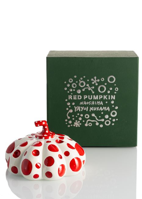 Kusama, YayoiMatsumoto/Nagano, 19298,4 x 13 x 13,5 cm"Pumpkin", um 2010. Farbige Kunstharzskulptur, in Orig.-Schachtel. Unterseitig bezeichnet "Naoshima" und mit Copyrightnachweis.Privatbesitz, Schweiz.