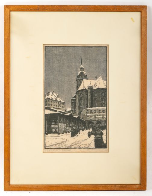 "Die Peterskirche in München", 1925. Farbholzschnitt auf Japanpapier. In Bleistift unten rechts signiert und unten links bezeichnet "Original-Holzschnitt Handdruck" sowie betitelt.