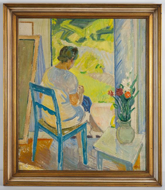 Nähende Frau am Fenster. Öl auf Leinwand. In Öl unten rechts monogrammiert.