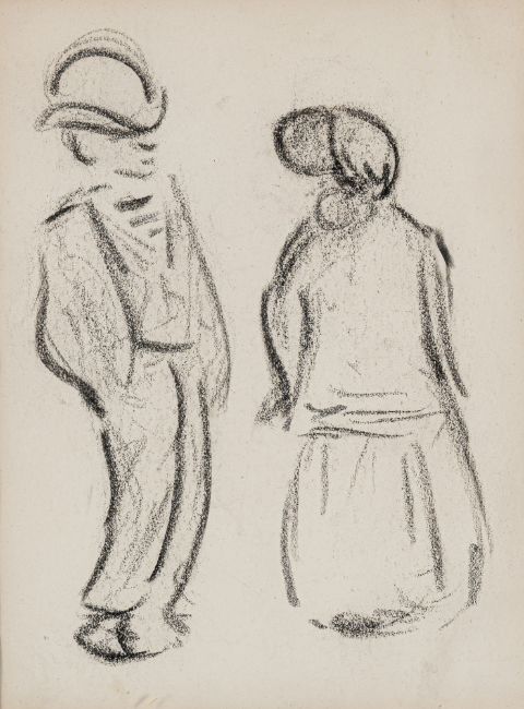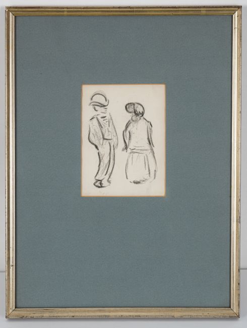 "Na, wie is et ...?". Kohle auf Papier. Rückseitig auf einem Galerieetikett betitelt.