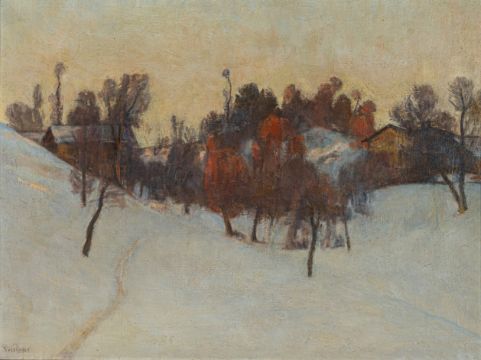 "Le vallon au coucher du soleil, Savièse". Oil on canvas. Signed in oil lower left and titled on the reverse of the stretcher.