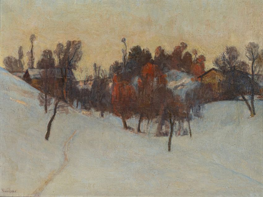 "Le vallon au coucher du soleil, Savièse". Öl auf Leinwand. In Öl unten links signiert sowie rückseitig auf dem Keilrahmen betitelt.