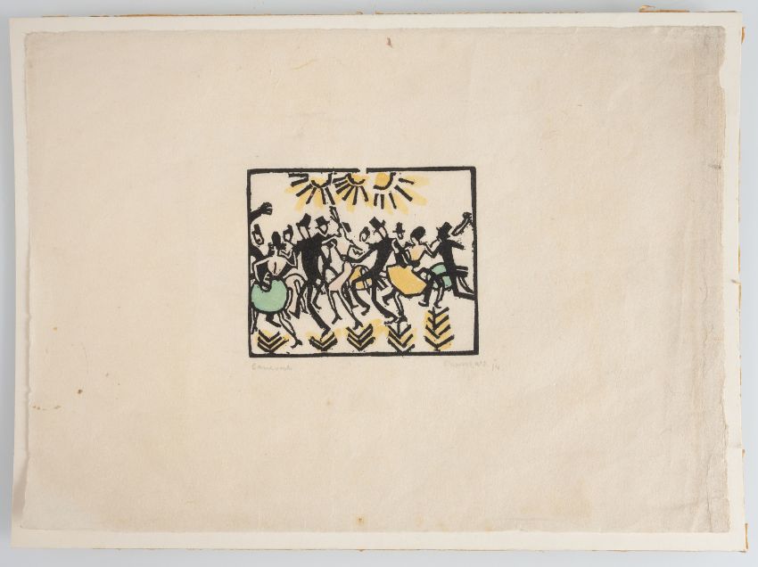 "Karneval", 1914. Watercolour over woodcut on Japanese paper. Signed and dated in pencil lower right as well as titled lower left.