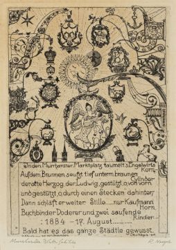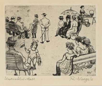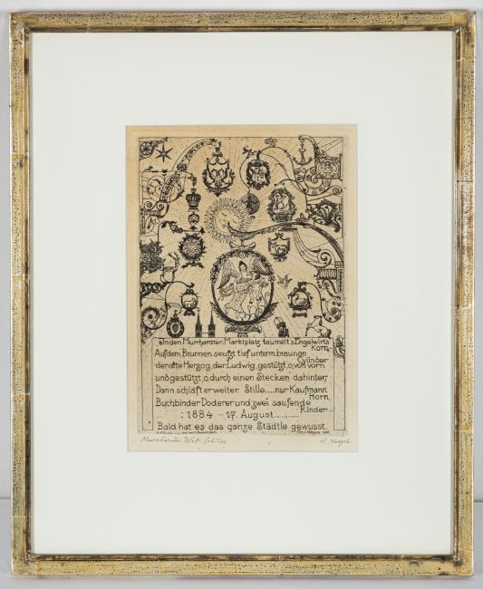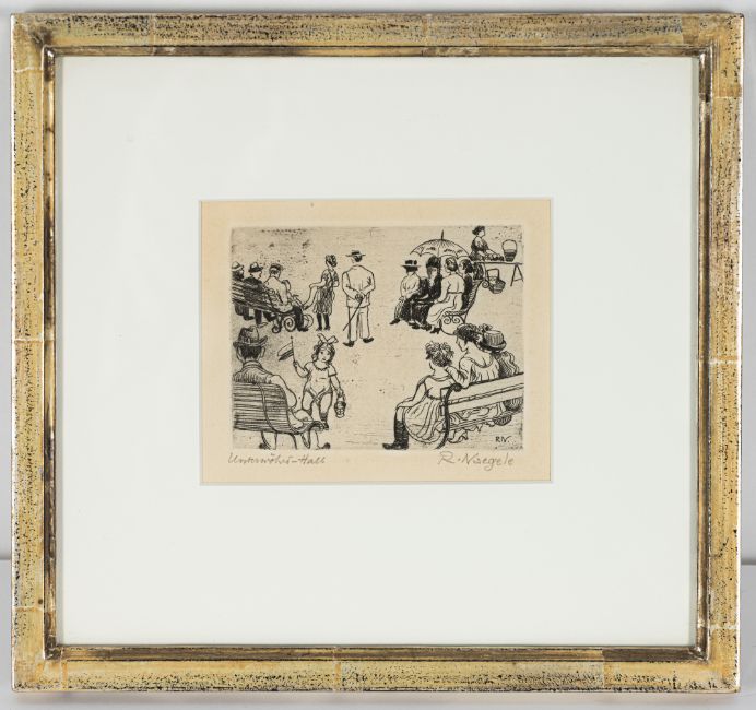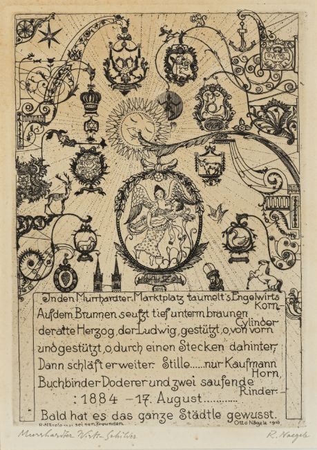2 works: "Haller Leute (Unterwörd)", 1911; "Murrhardter Wirtshausschilder", 1921. Etching on wove paper. Both signed and inscribed "Unterwöhrd-Hall"; "Murrhardter Wirtz-Schilder".